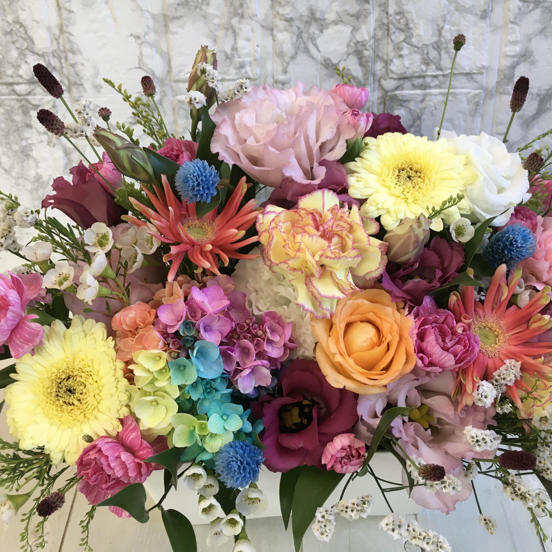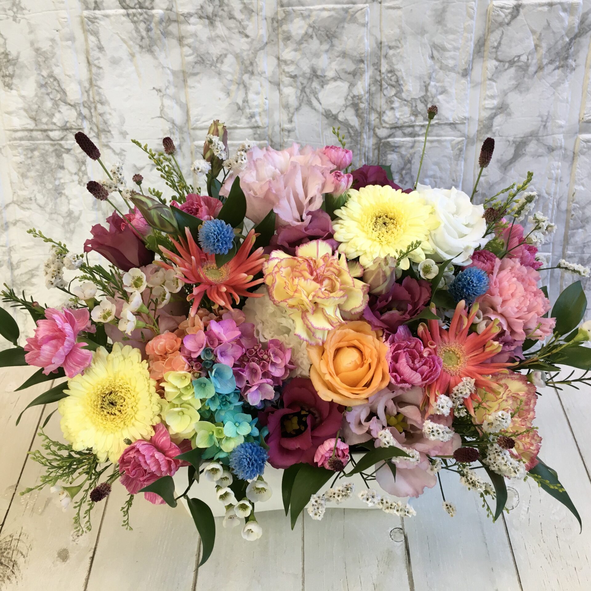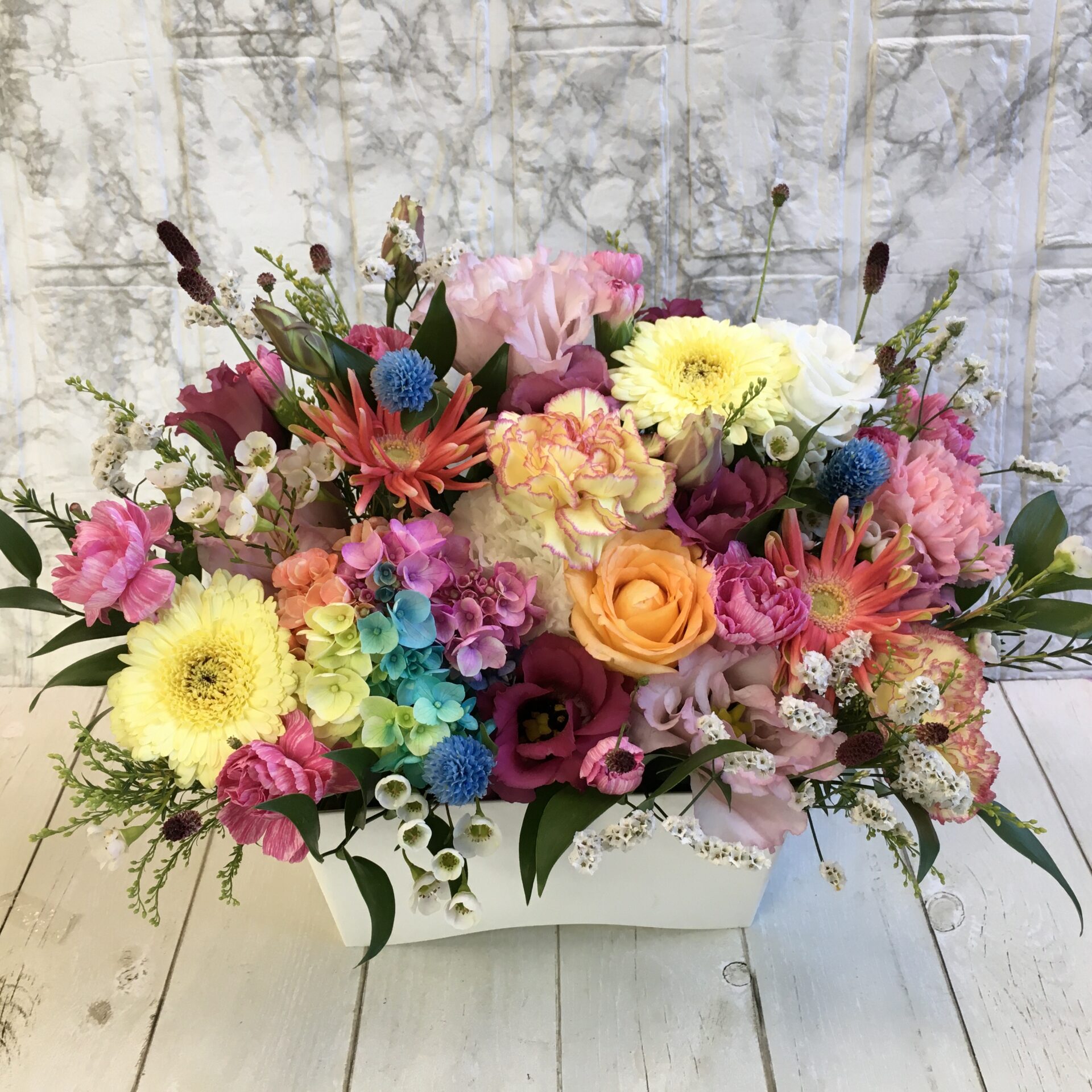 お祝いアレンジメント 開店祝いやお誕生日発表会などのギフトにぴったりな華やかなカラフルアレンジメントです。 期間お届け商品 6,600円(税込) 数量 カートに入れる 花 材:カーネーション 季節のお花 グリーン 資 材:容器 サイズ:(約)縦30㎝×横35㎝×奥行25㎝