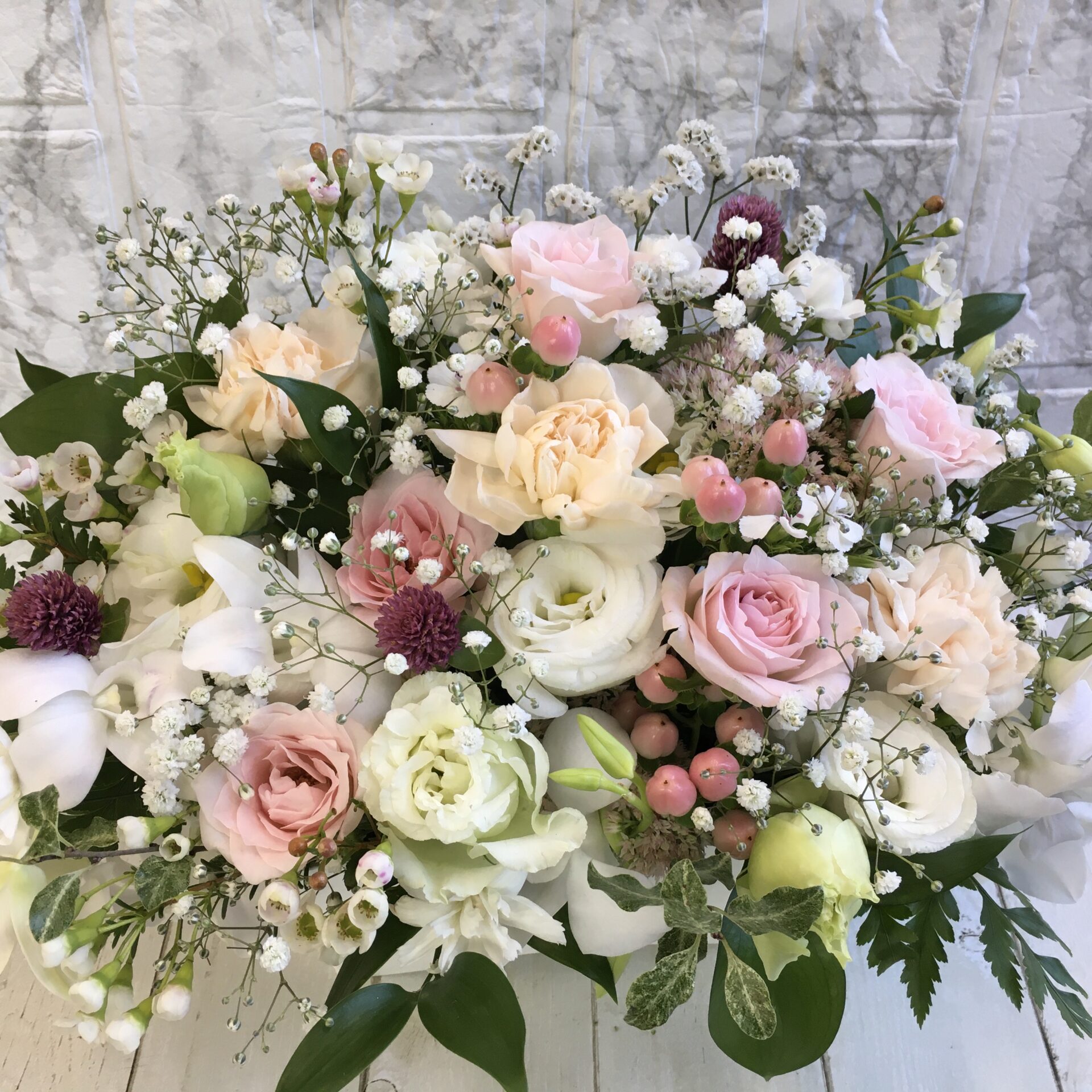 慈しみお供えアレンジメント 慈しみを感じるような、ホワイトピンクグラデーションが美しい色合いのお供えアレンジメントです。柔らかい色合いのバラを使用しております。 期間お届け商品 6,600円(税込) 数量 カートに入れる 花 材:バラ 季節のお花 グリーン 資 材:容器 サイズ:(約)縦25㎝×横30㎝×奥行25㎝