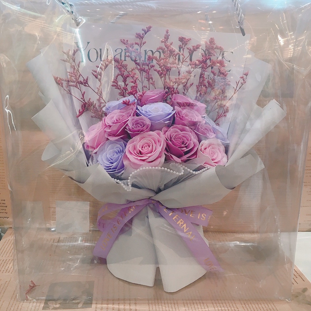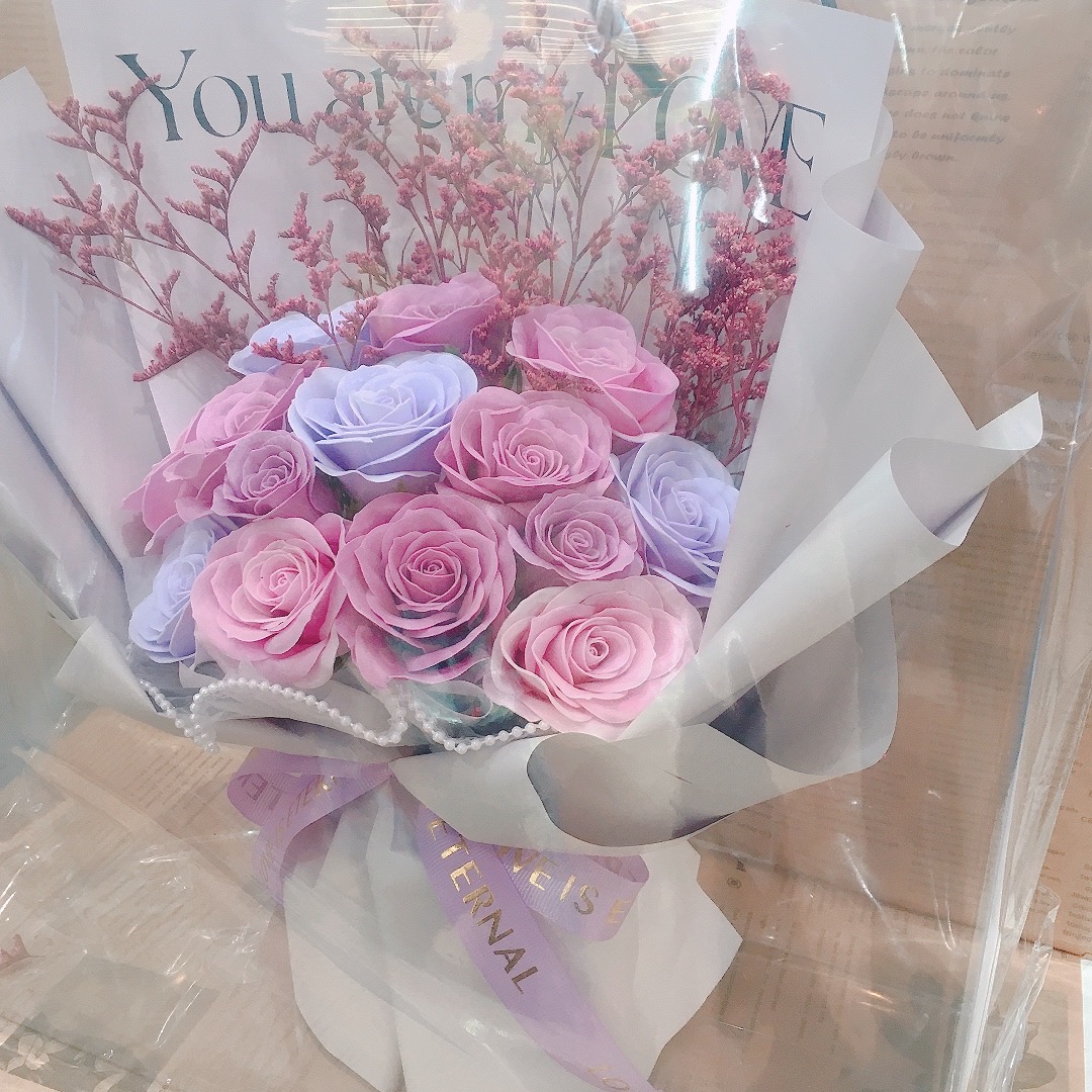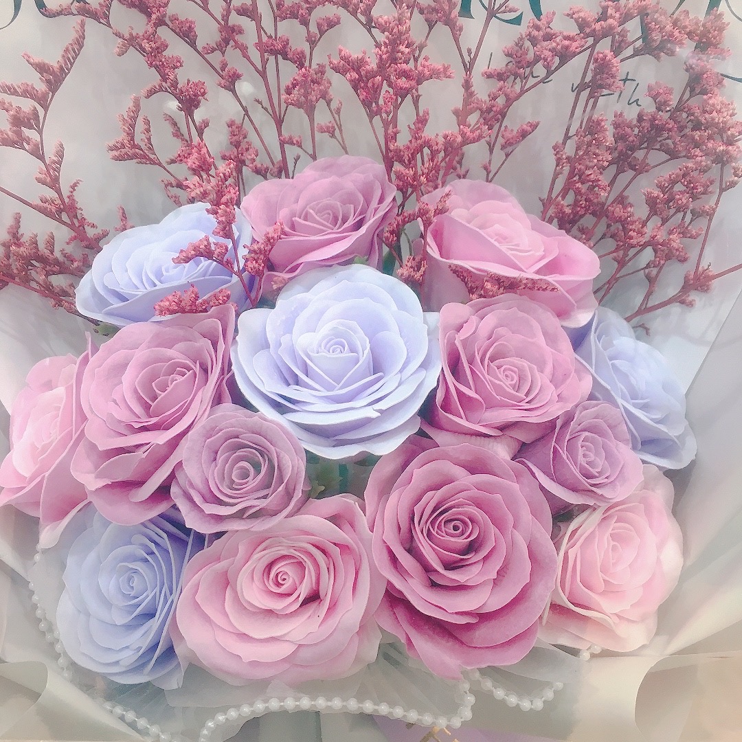 淡いパープルカラーのソープフラワーブーケ 淡いパープルカラーのソープフラワーブーケです。 石鹸素材で出来ているので優しい石鹸の香りがします。 5,500円(税込) 数量 カートに入れる 花 材:ソープフラワー 資 材:石鹸素材、紙、リボン サイズ:38cm×32cm(ソープフラワーブーケ)、41cm×39cm×17cm(化粧箱) コード : 2726012008032