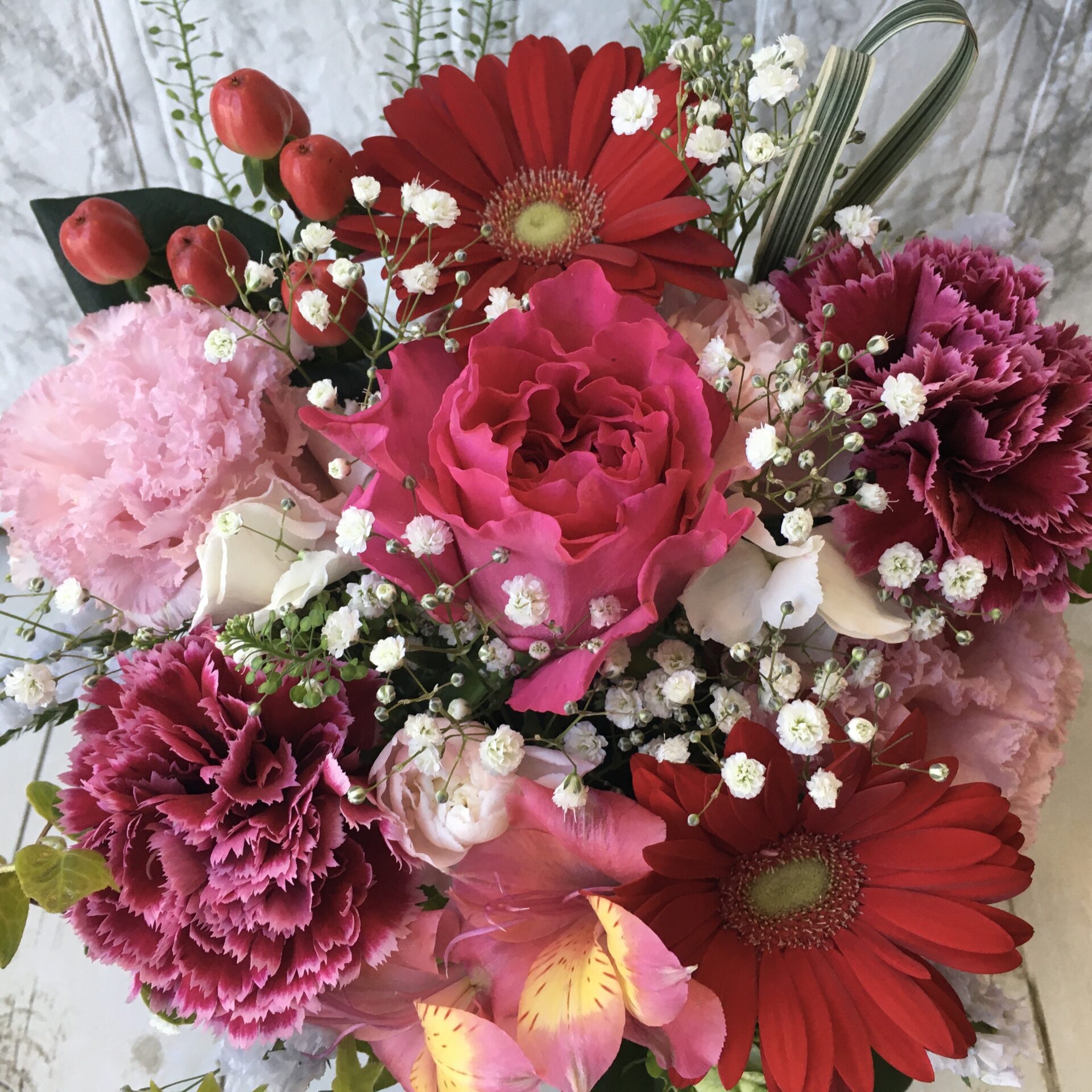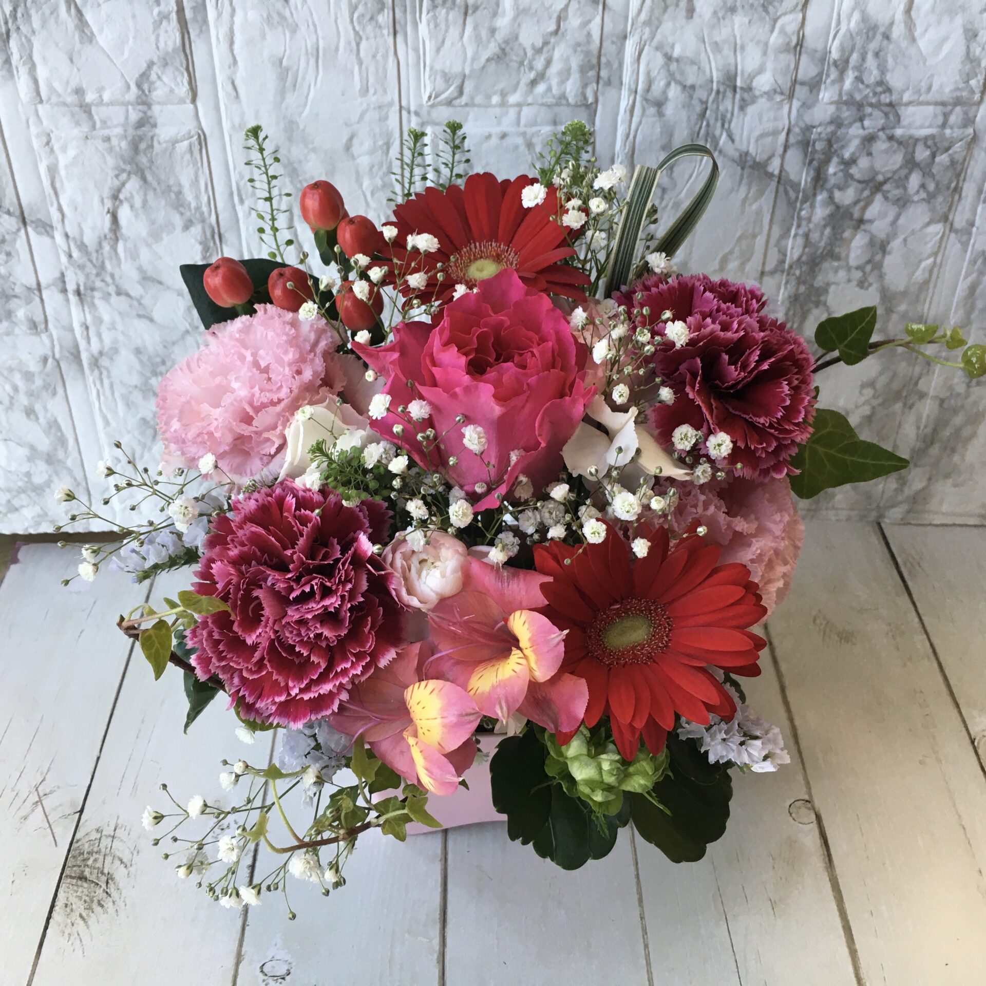 あふれる感謝を込めて。大人のレッド&ピンクアレンジメント 日ごろのありがとうを伝える贈り物として、鮮やかな深紅のガーベラと幾重にも重なる花びらが美しい濃いピンクのカーネーションを主役に、気品あふれるアレンジメントに仕上げています。、 期間お届け商品 4,400円(税込) 数量 カートに入れる 花 材 : ガーベラ カーネーション 季節のお花 グリーン 資 材:容器 サイズ:(約)縦25㎝×横25㎝×奥行20㎝